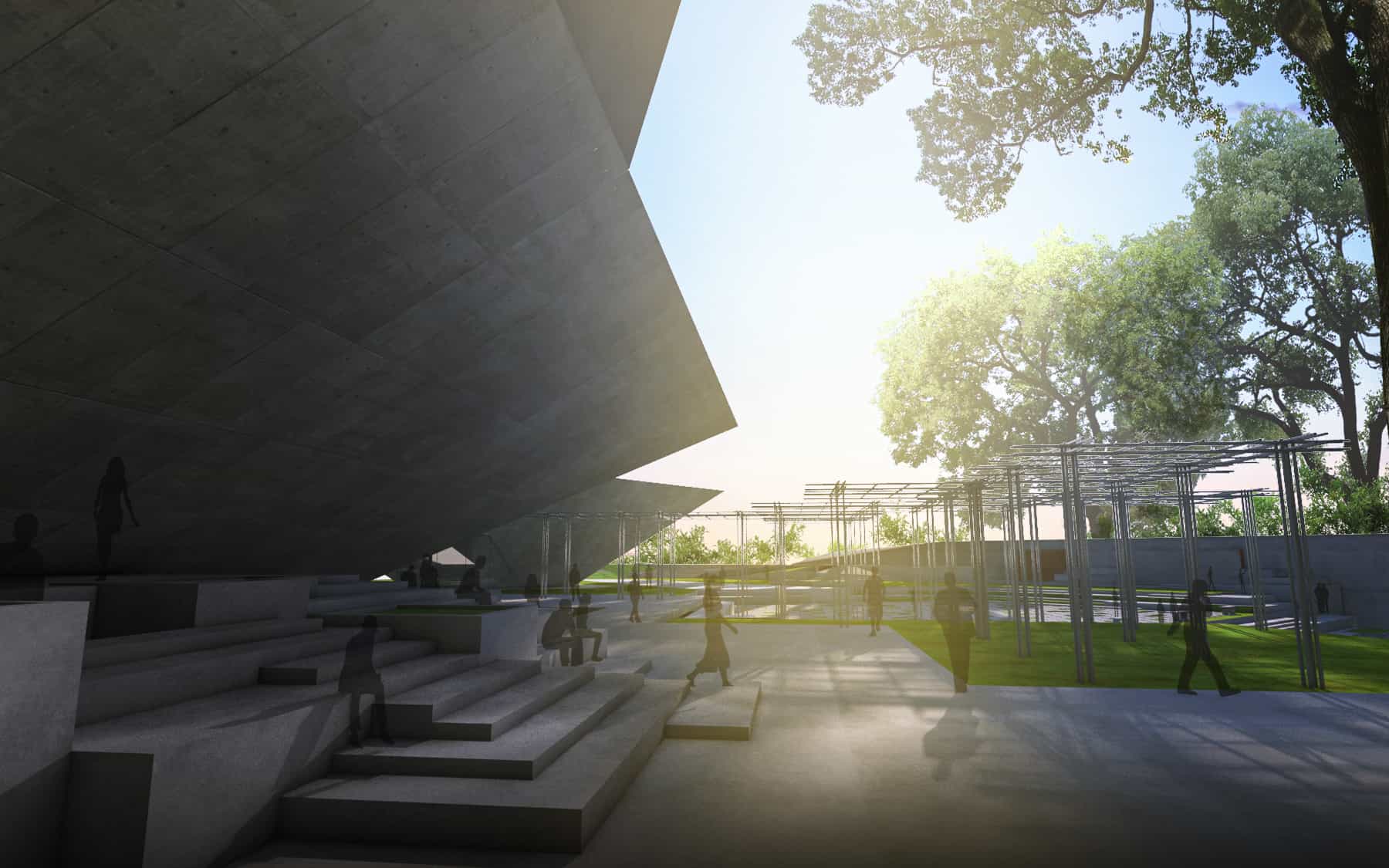 The entire program has been physically deconstructed and woven through the trees at different levels, alternating between sunken courts, terraces and elevated prongs, while the ground reacts by lifting and undulating, creating multiple points of connection with the trees.