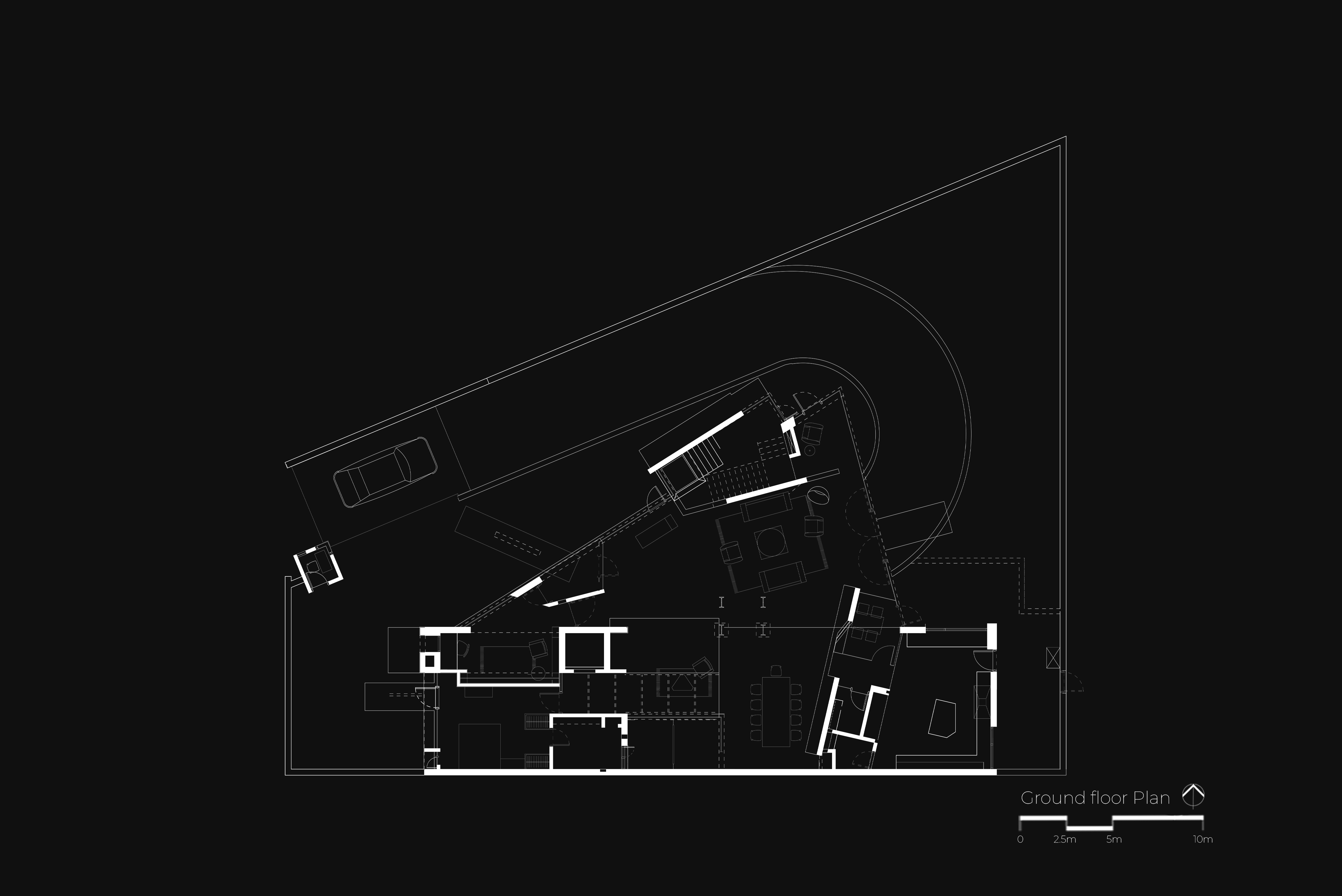 Visual continuity between the front and the rear gardens and the negation of built-up form at the ground level, allows the house to both embrace the form of the site, whilst ushering in natural light and ventilation. The structure itself is composed of shards of concrete that radiate from the narrow entrance to the expansive rear garden; both the visual and the physical flows.