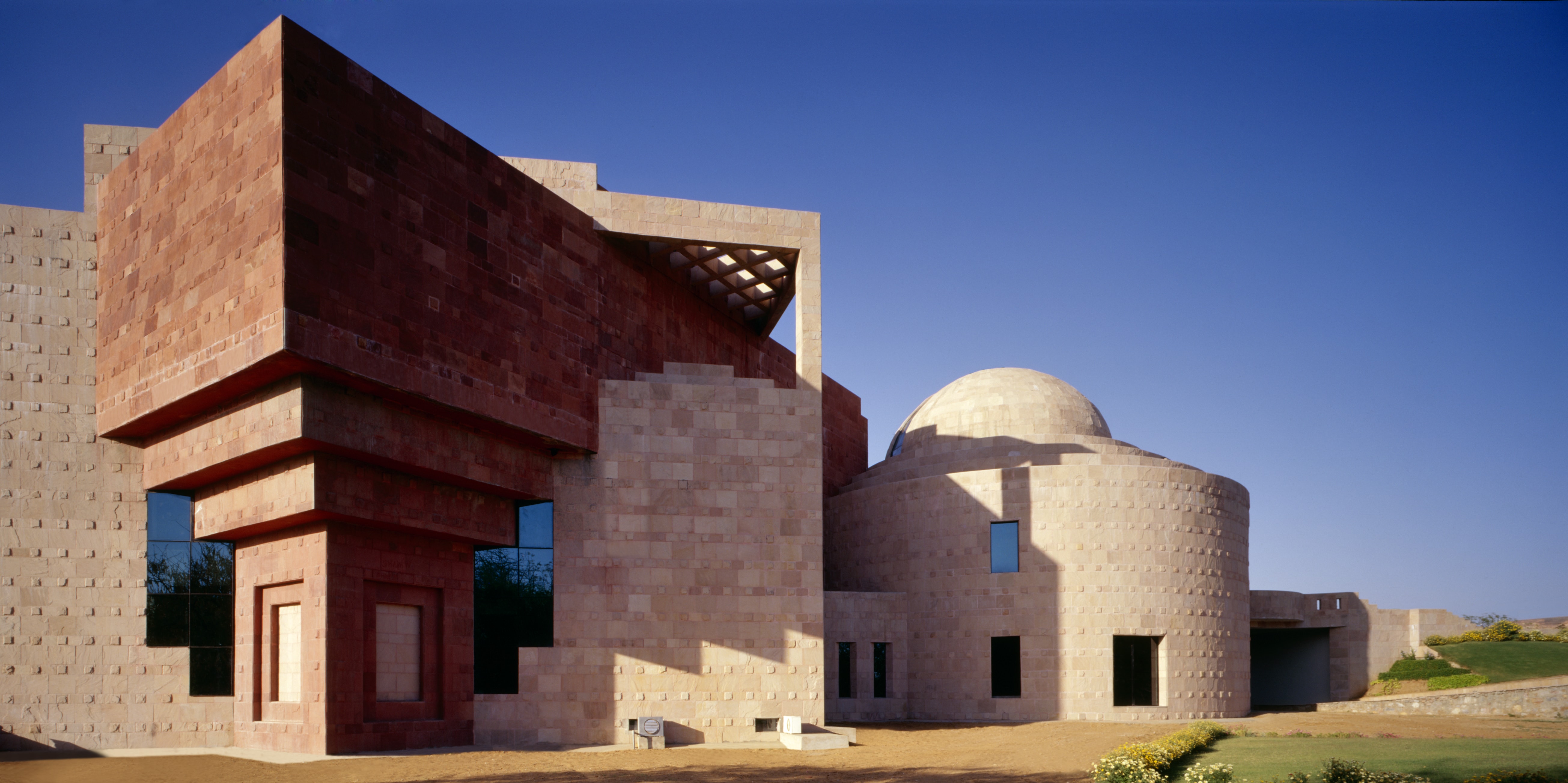The Bhagwan Mahaveer Cancer Hospital is conceptualized as virtually hewn out of a single monolithic block of stone, albeit in a contemporary avatar. The layered massing of the stone walls in the plug in ‘services’ units, the rhythm of the stone exteriors and the ‘Hubble Telescope’ dome are ‘metaphors’ from the fort walls the relief work in stone and Jai Singh’s observatory as much as the plan is inspired by the Jaipur Master-plan.