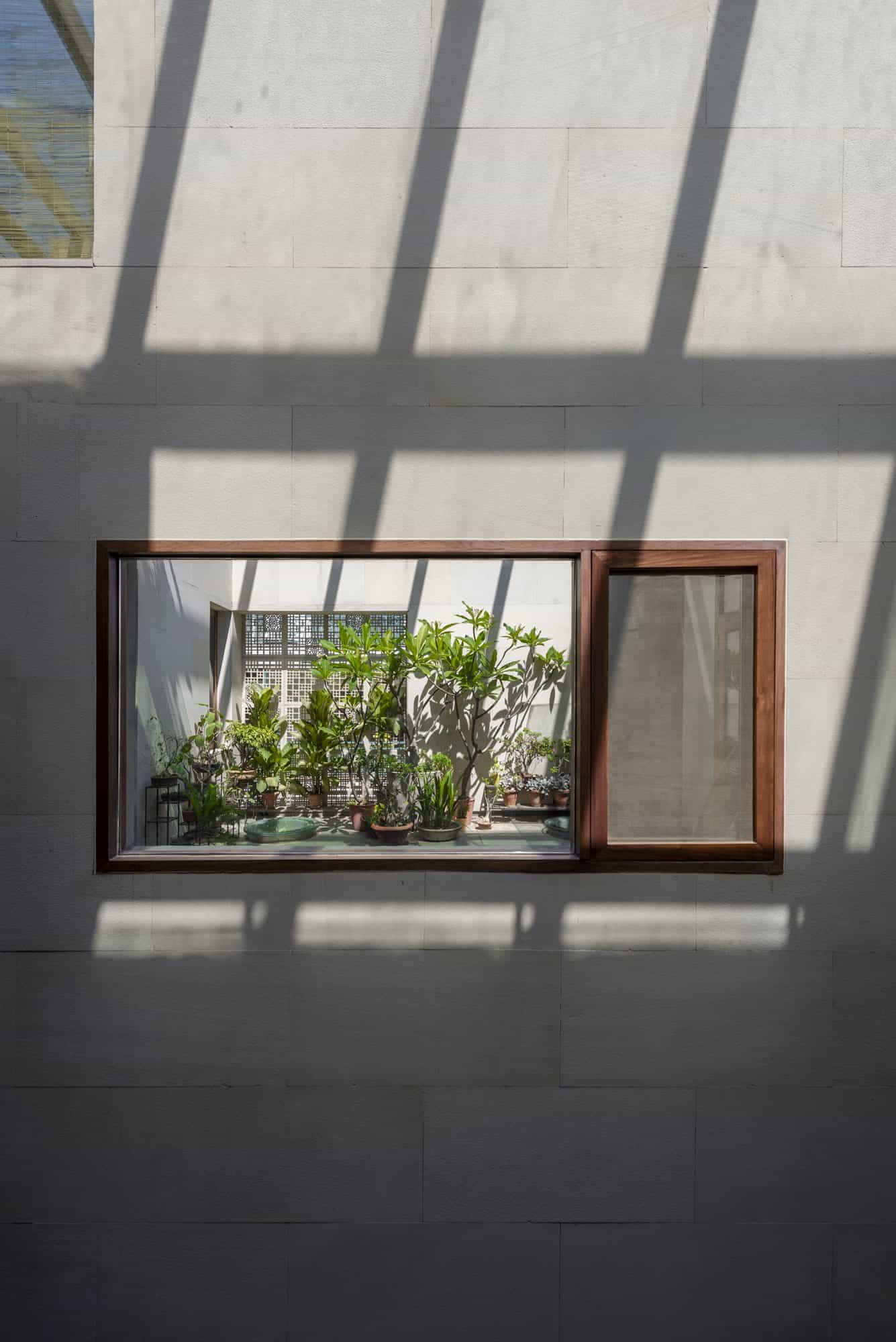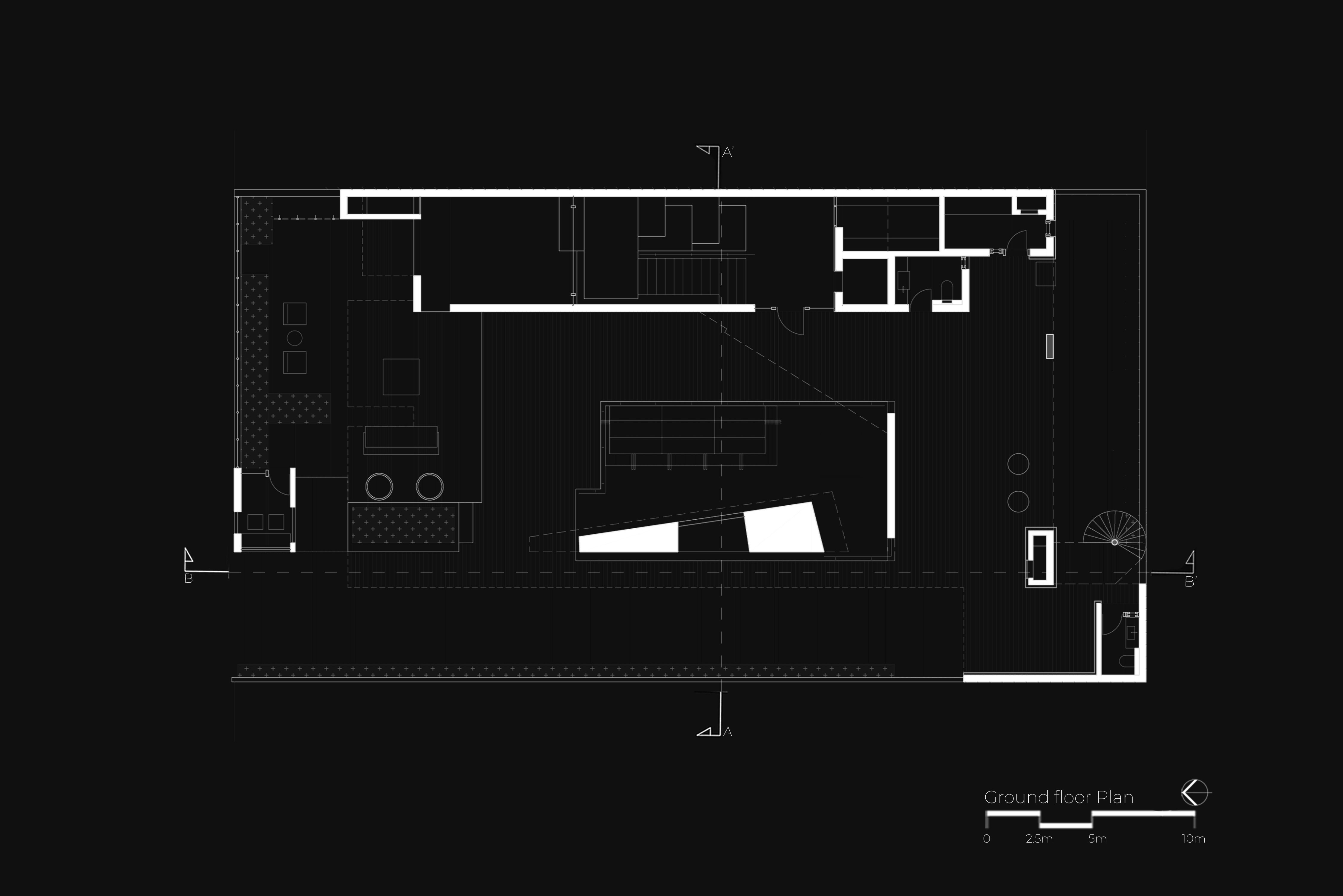 The central courtyard is a network of labyrinthine voids running laterally and vertically through the house working as a light catcher and thermal balancer and expressed as a combination of green spaces, deep fissures and skylights.