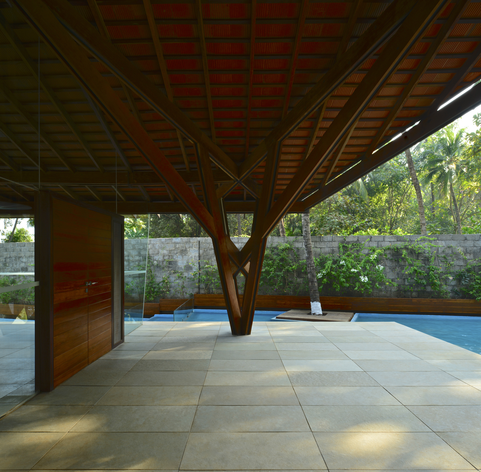 Our real challenge as far as the structure was concerned was to use the traditional materials / techniques and yet evolve an exhilarating and contemporary syntax. This was achieved by introducing a composite structural technology using thin steel plates sandwiched with wood planks. This opened up a fascinating window of achieving larger spans and also afforded us the ability to pick up the roof loads through numerous iterations and articulations.