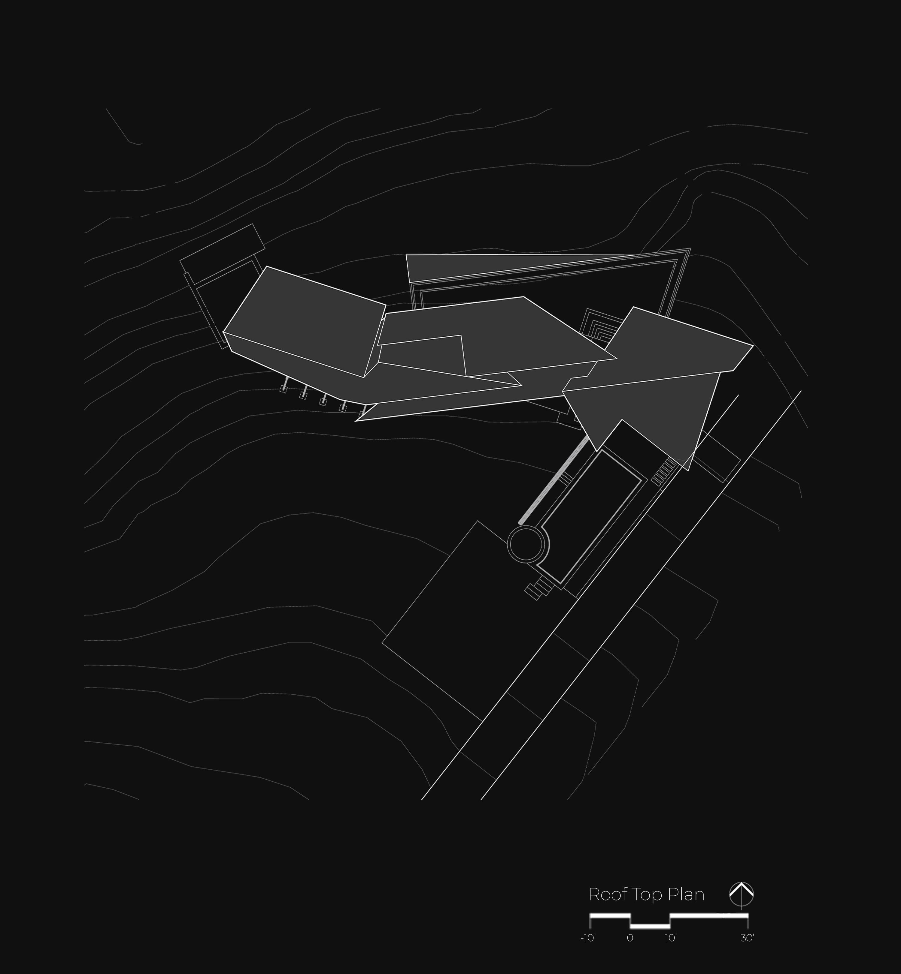 Gates ajar, one may peel the horizon in anticipation of conspicuous or imposing forms, but instead, is greeted by a lush landscape, which begins to unravel as a tapestry of textures across the canvas. A stately stone wall extends along the western fringe, punctuated by an outpost that nods to the fort and its bulwark in the east. Moving down the slope, the twin houses, eponymously titled Tungi 1 and Tungi 2, emerge from within the spindly trees—their metallic roofs, delicately folded like origami structures, beginning to peek through the foliage. Akin to wings or sails, they cascade across the site gently hovering over the undulating earth, seemingly reluctant to reveal the spaces they shelter.