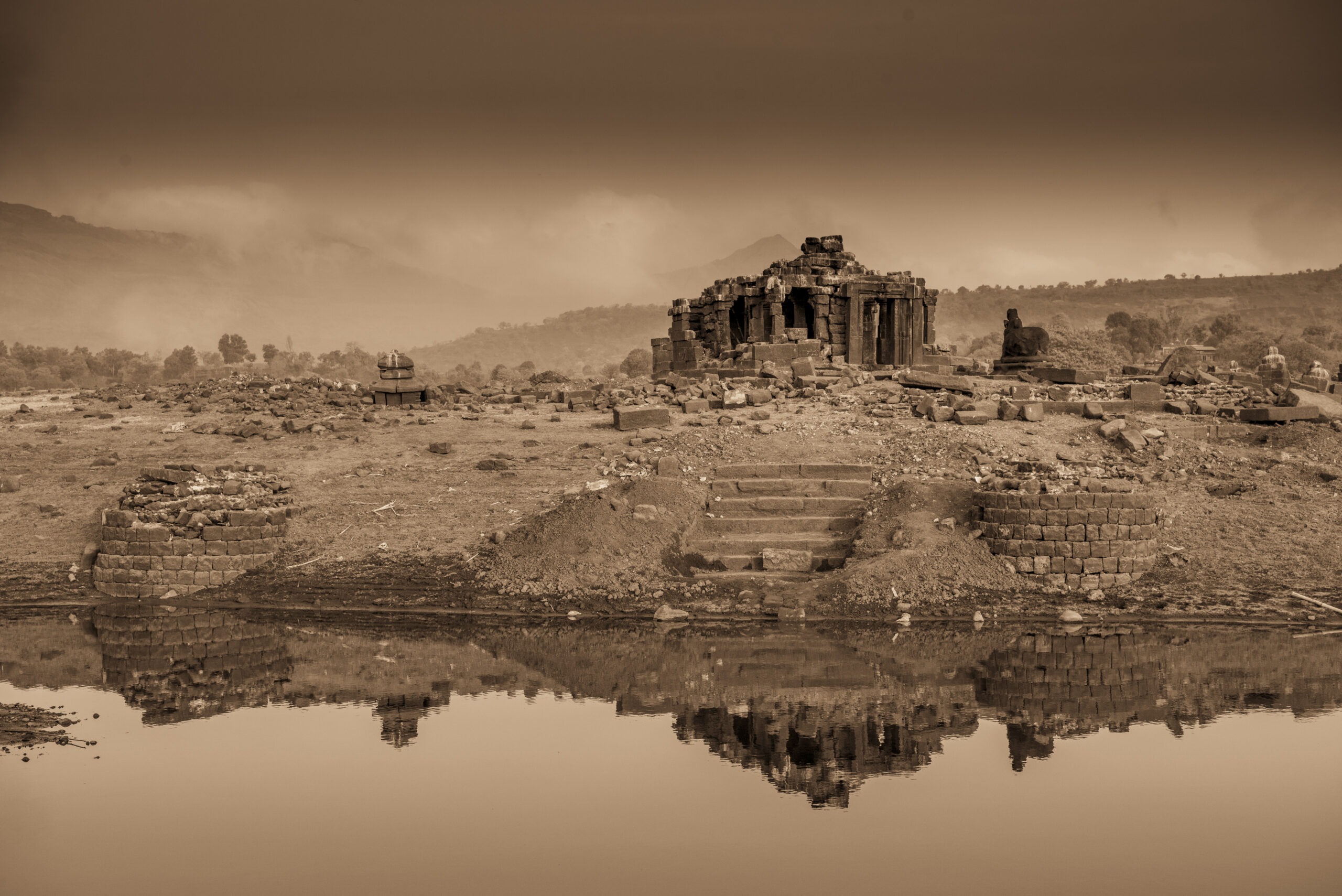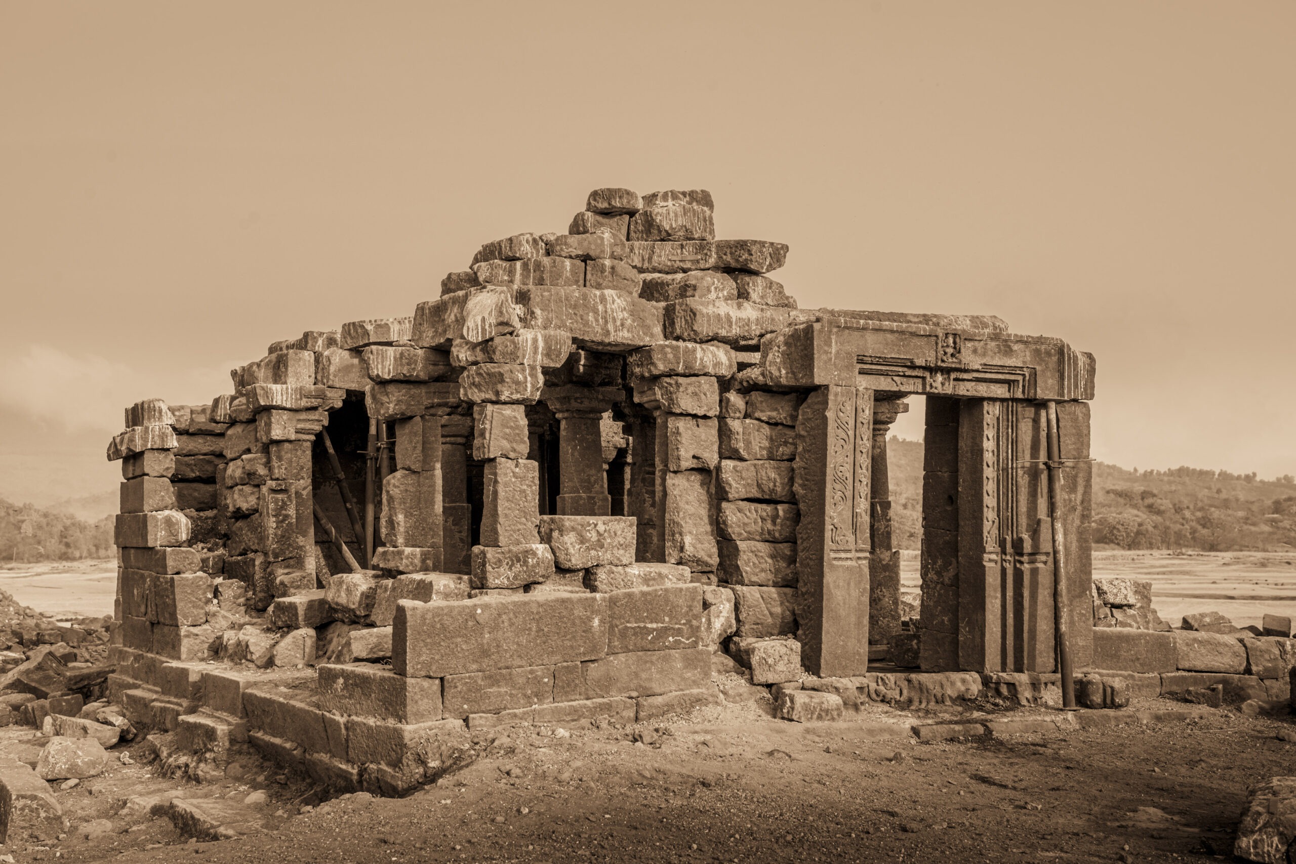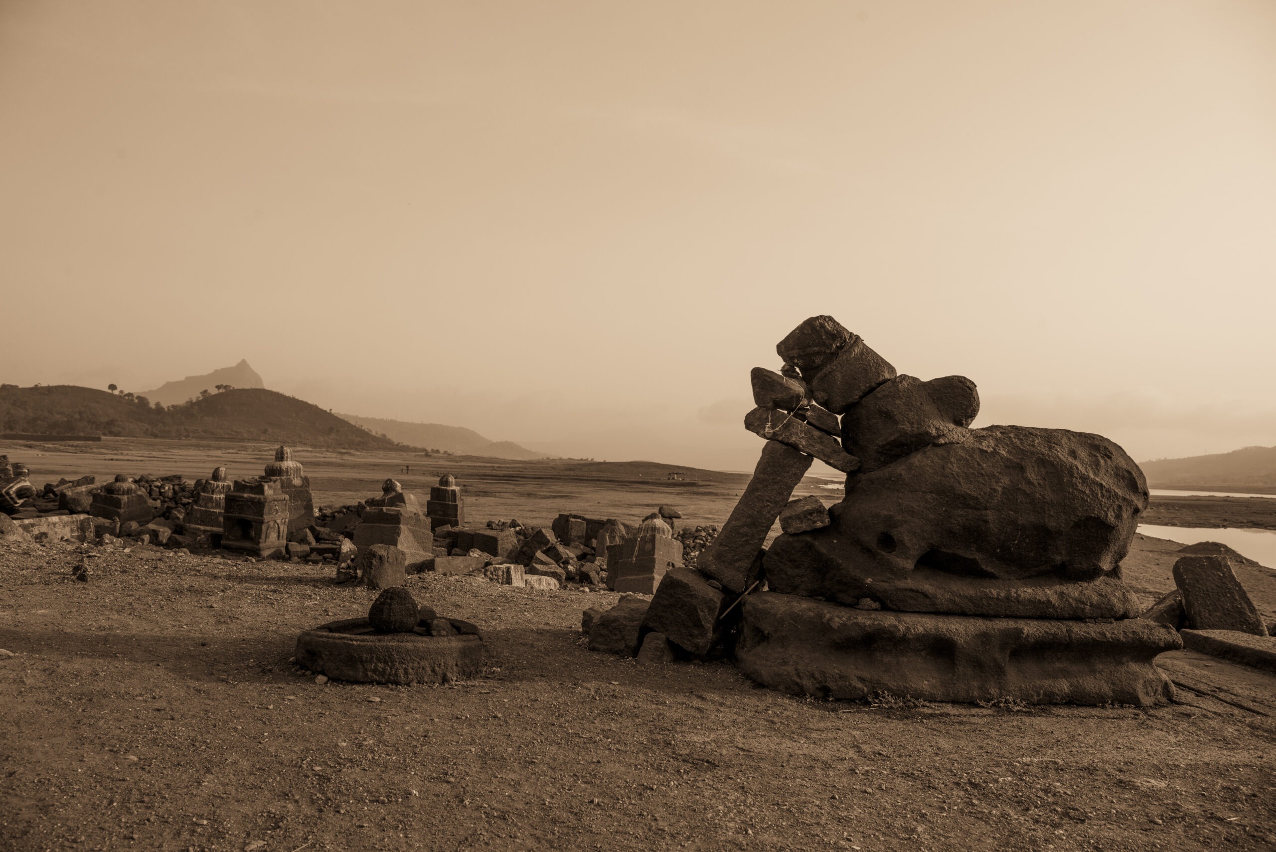 Located discreetly in the submerged depths of Pawna Lake, between the trinity of Tungi , Lohgarh and Tikona Fort. This 14th century temple magically reappears from the murky water on the onset of summers lasting till May when the dam discharges water from the lake. When we found the temple, the stone blocks from the temple were scattered all across the undulating landscape.owing to the periodic yearly cycle of filling and emptying of the lake, We at Malik Architecture, took upon ourselves to employ skilled stone masons from Rajasthan to put back together the 3D jigsaw puzzle of scattered stone blocks by systematically naming each block and carefully rebuilding it piece by piece using photogrammetry and 3D modelling softwares.